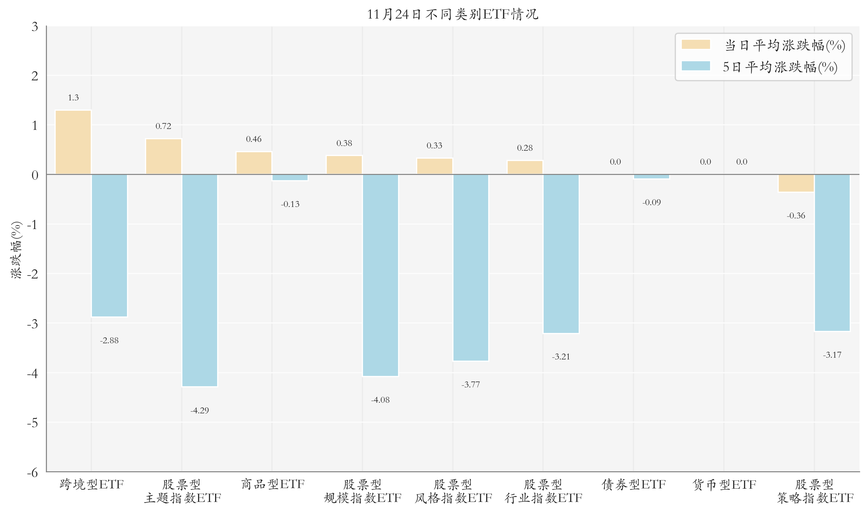 根据ETF基金的投资范围,将ETF基金划分为股票型规模指数ETF、股票型行业指数ETF、股票型策略指数ETF、股票型风格指数ETF、股票型主题指数ETF、债券型ETF、商品型ETF、货币型ETF、跨境ETF,今日跨境型ETF表现最优,该类ETF的平均涨跌幅为1.30%;股票型策略指数ETF的表现最差,该类ETF的平均涨跌幅为-0.36%。