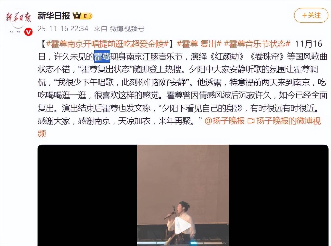 面对台下安静聆听的观众,霍尊难得流露出松弛一面:“我很少下午唱歌,此刻你们都好安静。”他透露特意提前两天抵达南京,享受当地美食与街景,这番家常对话与三年前那个被推至舆论风口浪尖的形象已判若两人。演出落幕时,他在社交平台感性发文:“夕阳下看见自己的身影,有时很远有时很近。感谢大家,感谢南京,天凉加衣,来年再聚。”字里行间透露出对舞台的珍惜与人生起伏的感悟。