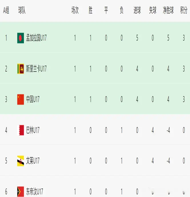A组积分榜如下:1、孟加拉3分(5/0);2、中国3分(4/0);3、斯里兰卡3分(4/0);4、巴林0分(0/4);5、文莱0分(0/4);6、东帝汶0分(0/5)。