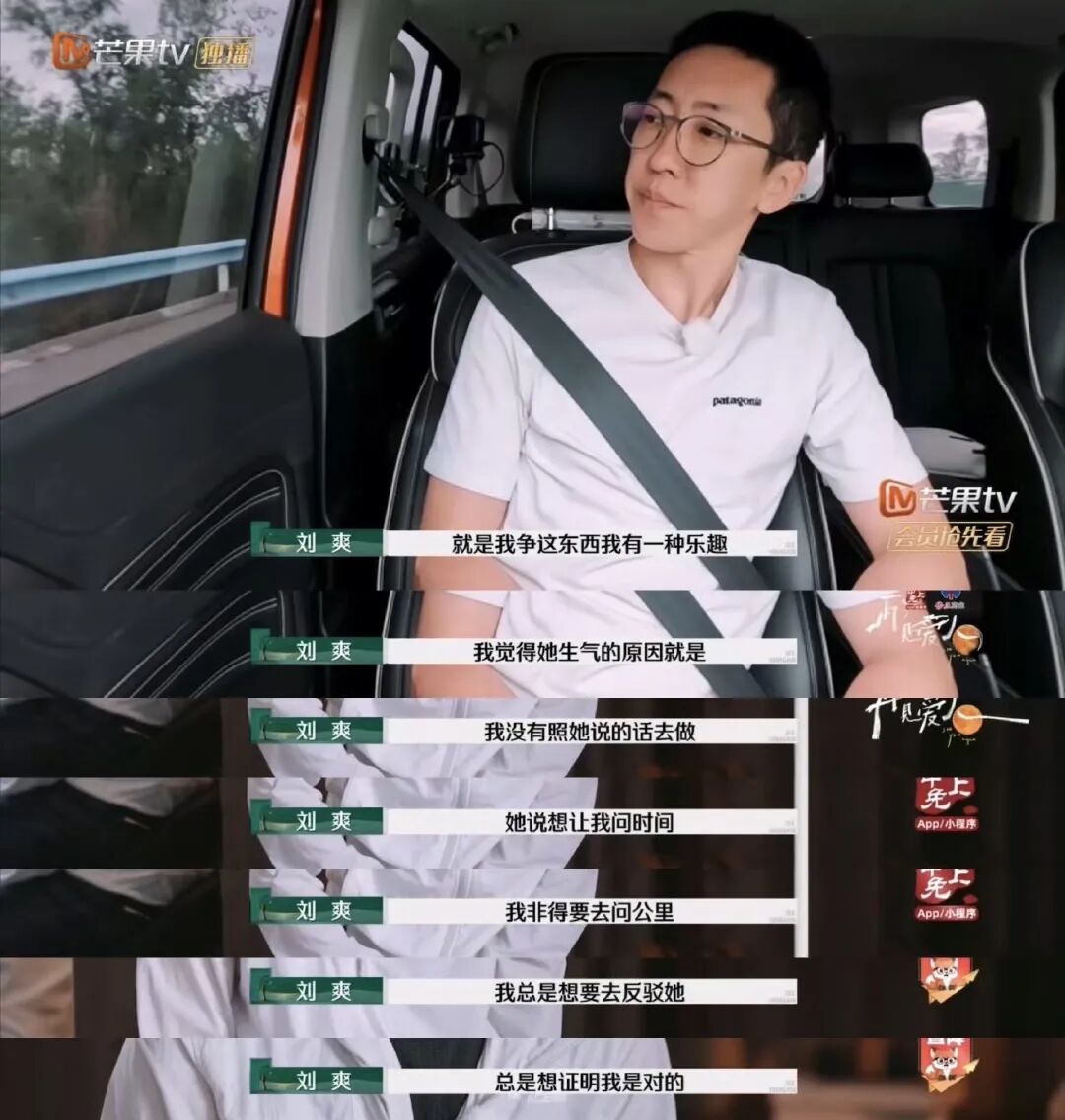 这时候刘爽开始输出各种理由了:什么对讲机一次不能问太多问题;什么休息的时候再问司机;什么到了服务区再问节目组。各种推辞、拖延、懒散,就是不肯如她所愿。葛夕发飙了,他终于问了,问的却是:“大概还有多少公里才到今天的目的地?”又没按照葛夕的意愿来,自己想怎么问怎么问。葛夕说她不懂多少公里,只想知道时间。他就反驳她,说她不懂数学,他懂。葛夕彻底暴怒,刘爽却乐在其中。他说争论这些东西,反驳她、踩她、否定她,总是想证明他是对的,她是错的,看她吃瘪、情绪崩溃,会给他带去一种乐趣,他享受这种赢她、占上风的感觉。他把自己的快乐建立在她的痛苦之上。完全不在意她的感受、不关心她的需要、不倾听她的诉求。就是一个劲儿地我行我素,我爽了,我舒坦了最重要。葛夕说这种情况在他们的现实生活中不是第一次了。每次她反馈自己的不满或需求,他都是嬉皮笑脸的,只会给她承诺画饼,却从来不认真实施履行。